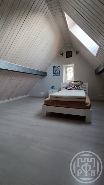 Качественная отделка помещений, ламинат высокого класса. Лестница выполнена из натурального дуба на металлокаркасе. Кухонный гарнитур из натурального дерева, каменная столешница, дорогая кухонная техника.