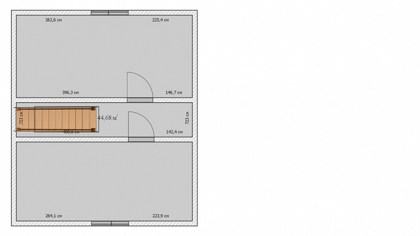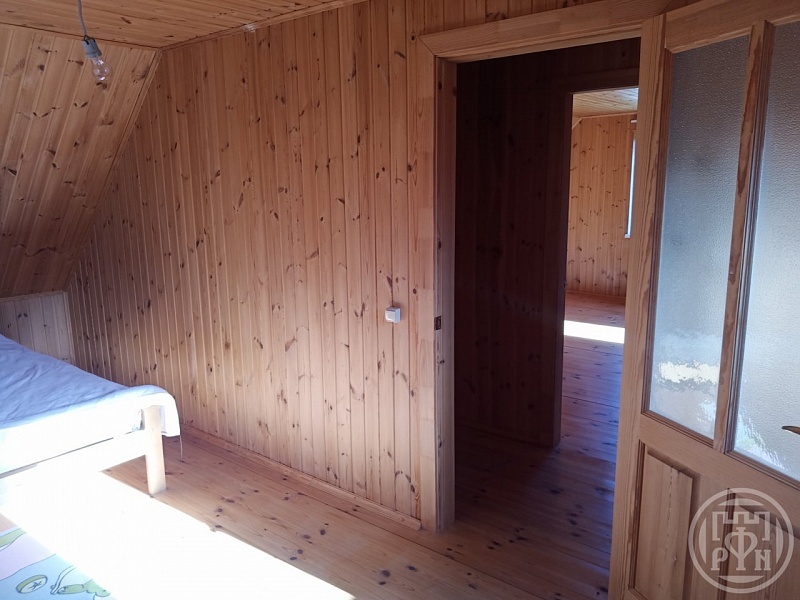 На первом этаже коридор и огромная комната с четырьмя окнами, что позволяет разделить комнату на несколько зон, есть фундамент под печку, сухой подвал в полный рост.