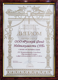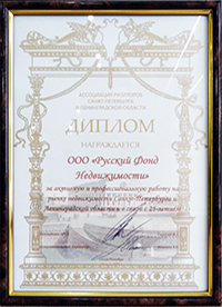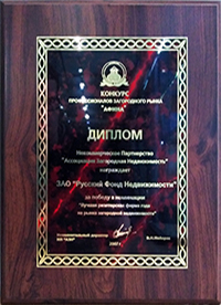 Компания "Русский Фонд Недвижимости" победила в номинации "Лучшая риэлторская фирма, численностью более 50 человек". Подтверждением этого стало вручение Диплома и статуэтки Каиссы.