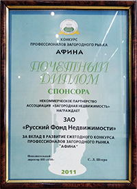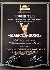 Компания "Русский Фонд Недвижимости" победила в номинации "Лучшая риэлторская компания на рынке загородной недвижимости". Подтверждением этого стало вручение Диплома и статуэтки Каиссы.
